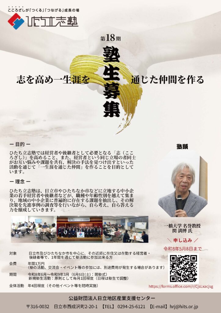 | 対象 | 日立市及びひたちなか市を中心に、その近郊に在住又は在勤する経営者・後継者等で、1年間を通じて塾活動に参加出来る方 |