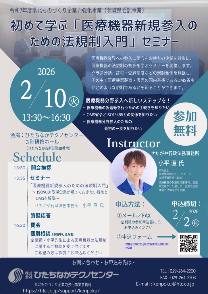 【ひたちなかテクノセンター】初めて学ぶ「医療機器新規参入のための法規制入門」セミナー 2026 1/12 関係機関からのお知らせ 2026-01-122026-01-15 ※ISO9001を取得済の企業にも、これからISO9001及びISO13485取得を視野に入れている企業にも、医療分野進出への後押しとなる内容となっております。 >>>お申し込みはこちらから 関係機関からのお知らせ よかったらシェアしてね! URLをコピーしました! URLをコピーしました! 【茨城県・いばらき中小企業グローバル推進機構】1/22海外展開セミナー~米国の医療機器産業・台湾の半導体産業の概況と海外販路開拓について~のご案内 セミナー「なぜ学生たちはこの地域の中小企業を選ばなかったのか」のご案内