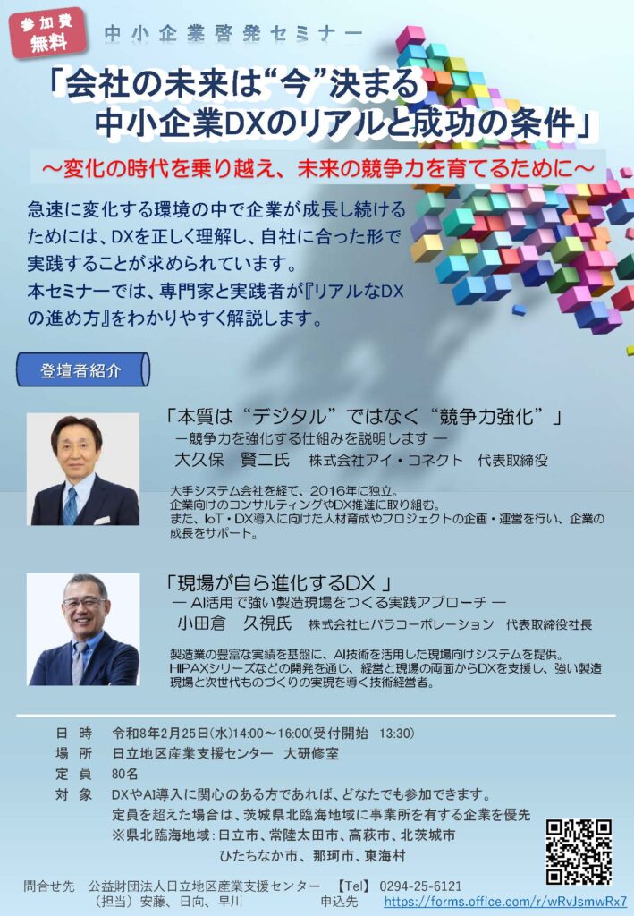 | 内容・登壇者 | 本質は“デジタル”ではなく“競争力強化” ― 競争力を強化する仕組みを説明します ― 大久保賢二氏 株式会社アイ・コネクト代表取締役 現場が自ら進化するDX ― AI活用で強い製造現場をつくる実践アプローチ― 小田倉久視氏 株式会社ヒバラコーポレーション代表取締役社長 |