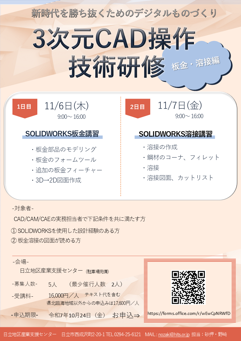 内容 | 第1日目 SOLID WORKS 板金講習(板金部品のモデリング、板金のフォームツール等) 第2日目 SOLID WORKS 溶接講習(鋼材のコーナー・フィレット等) |