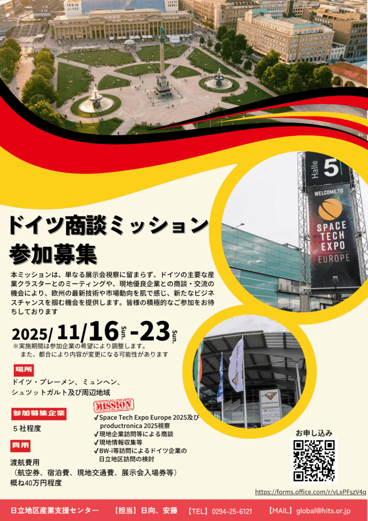 11/18~20にドイツ・ブレーメンで開催されるヨーロッパ最大の宇宙産業展「Space Tech Expo Europe 2025」、また11/18~21にドイツ・ミュンヘンで開催される電子部品製造機器展「productronica 2025」に合わせ、ドイツ商談ミッションの参加者を募集します。