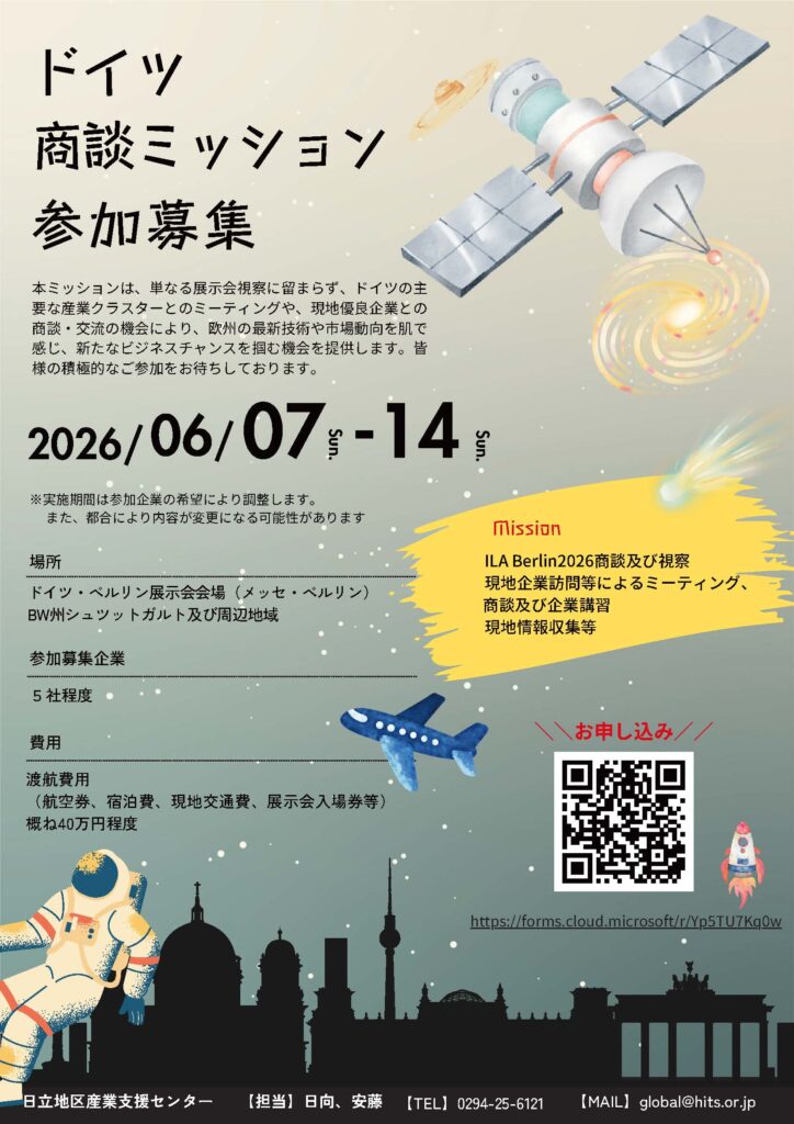 | お問い合わせ | 日立地区産業支援センター 【担当】日向、安藤 【TEL】0294-25-6121 【MAIL】global@hits.or.jp |