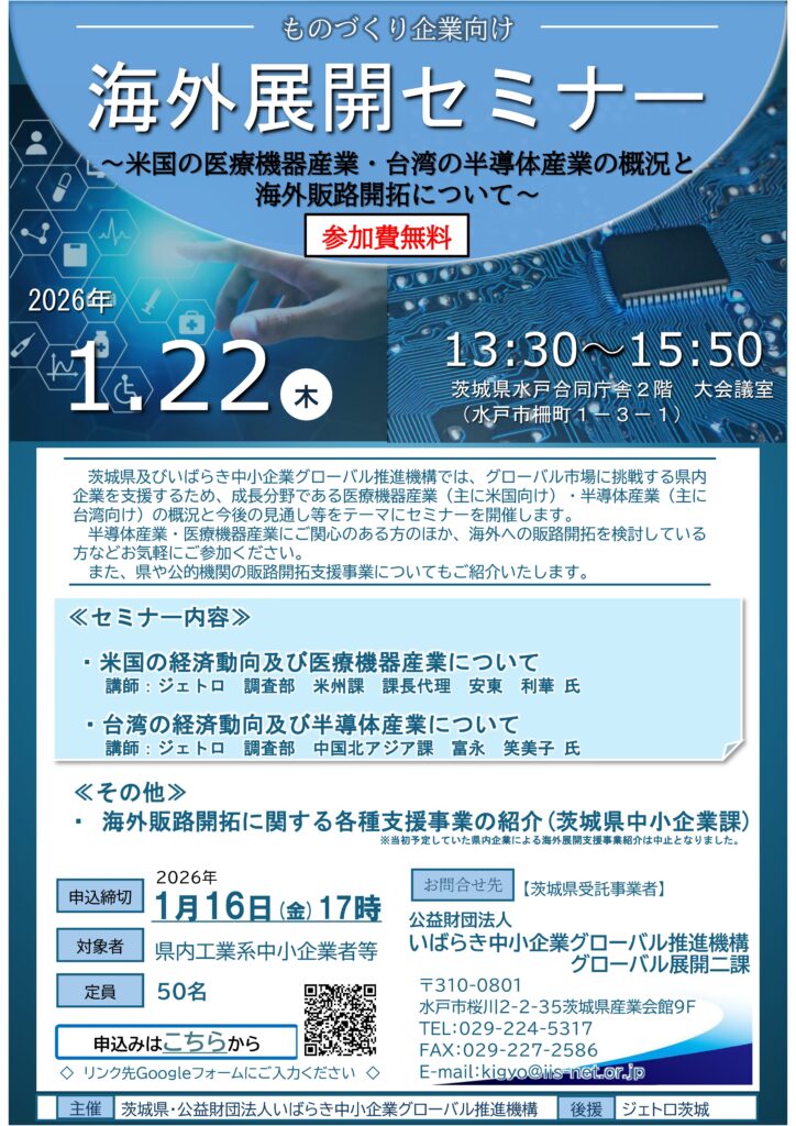 【茨城県・いばらき中小企業グローバル推進機構】1/22海外展開セミナー~米国の医療機器産業・台湾の半導体産業の概況と海外販路開拓について~のご案内 2026 1/09 関係機関からのお知らせ 2026-01-09 >>>チラシのダウンロードはこちらから >>>お申し込みはこちらから 関係機関からのお知らせ よかったらシェアしてね! URLをコピーしました! URLをコピーしました! 【茨城県産業技術イノベーションセンター】2/17「ビジネスアイデア提案会2026」のご案内