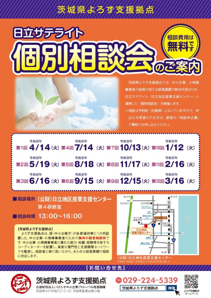 茨城県よろず支援拠点「日立サテライト個別相談会」のご案内 2026 4/14 関係機関からのお知らせ 2026-04-14 >>>チラシ、申込書のダウンロードはこちら 関係機関からのお知らせ よかったらシェアしてね! URLをコピーしました! URLをコピーしました! 令和8年度の事業計画を掲載しました!